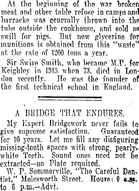 At tho beginning of tho war broken, meat and other table refuse in camps and barracks was generally thrown into the. tubs outside the cookhouse, and sold as swill for pigs. But now glycerine for munitions is obtained from this "waste" at the rate of 1200 tons a year. Sir Swivo Smith, who became M.F. for Keighley in 1315 when 73. died in London recently. Ho was the founder of tho first technical school in 'England. A BRIDGE THAT ENDURES. My Expert Ilridgework never fails to givo supreme satisfaction. Guaranteed for 10 years. Let me fill any disfiguring missing-tooth spaces with strong, pearly, white Teeth. Sound ones need not be extracted—no Plate required. W. P. Sommerville, "The Careful Dentist," Molesworth Street. Hours: ? a.s», to 6 p.m.—Advt.