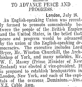 TO ADVANCE PEACE AND . PEOQEESS.- ■ ■ ■■■,'•■ London, July IS. An English-speaking Union was recently formed to promote comradeship between the'people of. the.British Empire arid'the. United States, in the belief that pence and progress would be advanced by tho union of the. English-speaking demoeracics. The executive includes Lord Bryce, Mr.-Winston- Churchill, tho Archbishop of York, and' liiariy notables. Mr. W. 1 ,, . Massey (Primp Minister of. Kew Zealand) was , elected -ii ! vice-president. It 'is proposed t6 establish "headquarters in ■London, New York, aud , each of tho capitals of the overseas. .Dominions.'—Aus.v N.Z. Cable Assn. • ...