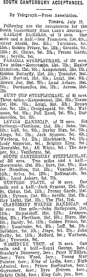 SOUTH CANTERBURY ACCEPTANCES. By Teksraph.—Press Association.' Timai-u, July 19. Following are the acceptances for tho SouLli Canterbury UuntOuibd MeetiUß:— IiADLOW" IIUUDLbH, .of VS sovb. One mile and a half.—Don Francisco, list.6lb.; .Silver bhield, Hist. 81b.; , Turehauu, 9st. 131b.; Golden Prince, 9fil. 131b.; Giralda, 9st. 131b.; St. Oletus, 9at. 21b. j l'rouez Garde, Sat.; Seville, %L PAKIiOKA ttTKEPLECUASE, of 100 sova. Two miles.—llorccambe, 13et. 71b.; iluetcr Kauiiliou, 12st. 91b.; Kaupoliouui, 12st. 71b.; Goldon llutterny. list, jib.; Transfer, lOet. 131b.; Martial, lOst. 91b.; Luini, Wat. 91b.; Urowu Joe, Met. 91b.; Land Ashore, Met. 91b.; Dardanelles, lOst. 71b.; Across, ldst. 71b. HUNT OUl> fiTKKPLECHASE, or 80 sovs. Threo miles.-Kiiupokonui, 12st. 21b.; Transfer, lOst. 71b.; Lulgl, Wst. 31b.; Brown Joe, 9st. 131b.; Craigdugald. 9sl. 91b.; Waiiiono, 9at. 51b.; Full Hand, Sat. 91b.; Dardanelles, 9st. 91b. LBVISLS HANDICAP, of 70 both. Six furloucs.-Flccthaui, list. 31b.; Hobs. lOst. 51b.; LqlV, 9st. 91b.; Barley Kiss, 9«t. 91b.; Jingo, 9st. 71b.; Jack Syinons, 9st, 41b.; Warform, 9st. 21b.; Hlackheatli, 9sl. 21b.; Lady Buperior, 9hL; Beleian Kldk, 9st.; Moorabbe, 9st.; All White, 9st.; The Happer, 93t.; Vociferate, Sst. SOUTH CANTERBUIty STEEPLKCIIj.KK, of 300 sovs. Two miles and a half.— ilorcNimbc, 12et. 51b.; Bore, list. 911).; Master Hamilton, list. 31b.; Vneeular.' 10.4. 131b.; Sylva, 9st. 121b.; Eollinßtide, 9et. 61b.; Land Ashore, 9st, 71b. KUNTKIiS' I'LATE. of 50 bovb. One mile and a half.-Jack Symons, 12st. 5!1>.; St. Oletus, llKt. 111b.; Prenez Garde, list. 111b.; Hytena, list. 91b.; Seville, list. £lb.; Clay Light, list. 31b.; Tbe Flat, list. CIjARBJIOST WELTEJJ HANDICAP, of DO eovs. One mile.—John Barleycorn, list. 111b.; Majeatikoff, lOst. 111b.; Ardmore, lOst. 81b.; Fleetham. lOst. 81b.; Hiero, Wst. 311).; Handy, 9st. 111b.; Golden Prince, 9st. 81b.; Kaminohe. 9st. 81b.; Luff, 9sl. 51b.: licllnhire, 9st, 31b.; Jiupo, 9st. 21b.; John P.eilly. 9st. 111b.; Jtelford, 9st.; AVarform, 9st.; Tasconia, 9st. WABHDYKE TItOT. of 75 bovs. Ouo milo and a lialf.—Koyal Georße, 2bcc; Stanley's Discovery, 3sec.; Peter M'Jlillnn, 3ecc.; Ye'ra Wood, 3sec; Youiiß SJnr Pointer. (J6cc; Kinp of Lydia, 6sec.; Digh Admiral, 6sec; Prince Burlington, 6sec; Guynemer, 6sec; Eyre Heiress, Beec; Bright Child, Bsec; King Cole, jun., 3tec.