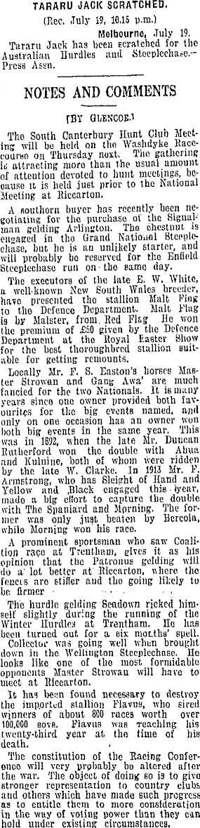 TARARU JACK SCRATCHED. (Rec. July 19, 10.15 p.m.) Melbourne, .Tuly 19. Tararu Jack has been scratched for the Australian Hurdles and Stoeplcchadc.Prcsß Assn. NOTES AND COMMENTS j TBY GMNCOE.I Tho South Canterbury Hunt Club Meeting will be held on tho Washdyke Kaceeoureo on Thursday next. Tho gathering it; attracting more- than the usual amount of attention devoted to bunt meetings, because it is held just prior to the National Meeting at Riccarton. A fiouthorn buyer has recently been ncBotiatiiig lor the purchase ot the Signalman gelding Arlington. Tho chestnut is enraged in tho Grand National Stci-nlc-cliiise, but he is an unlikely starter, and will probably bo reserved for the Enfidd Steeplechase run on ■ tho same day. The executors of the late E. W, White, a well-known New South Wales breeder, have presented tho stallion Halt King, to tho Defence Department. Halt Flag, is by Malster, from. Bed Fliff He won the premium of £50 given by the Defence Department at tho Koyal Easter Bhqw for the best thoroughbred stallion suitable for getting remounts. Locally Mr. P. S. Easton'a horses Maßter Strowan and Gang Awa , are much fancied for the two Nationals. It is many years since one owner provided both favourites for the bjg evente named, and only on one occasion hae an owner won both big events in the same year. This was in 1892, when the late Mr. Duncan Rutherford won tho double with Alma nnd lCuluinc, both of whom were ridden by the late W. Clarke. In 1913 Mr. P.. Armstrong, who has Sleifrht of Hand and 'Yellow and .Black engaged this ■ iyear, made a big ellort to capture the double with The Spaniard and Jlprning. The former was only just beaten by Bcrcola, while Morning won bis race. A prominent sportsman who saw Coalition race at Treuthani, elves it as his opinion that the Patronua gelding will do a , lot better at Riccarton, where the feucis are EtilTcr and tho goiug likely to be firmer ■ ■• • • ■ > The hurdle gelding Seadown ricked himeelf slightly during the running of the Winter HurdlM at Trentham. Ho has been turned out for a nix moLthu' spell. Collector was going well whtn brought down in tho Wellington Steeplechase, lie looks like one of tho most formidable opponents Master Strowau will have to meet at Rlccarton. It has be«n found necessary to destroy the imp.orted stallion Plavus, who eired winners of about 800 races worth over 100,000 sove. Flavuß was reaching his twenty-third year at the, time of his death. The constitution of the Racing Conferonco will very urpbably bo altered after the war. The object of doing so is to givo etroneer representation to country clubs aud others which havo made such progress as to entitle them to more consideration in the way of voting power than they can hold under existing circumstances.