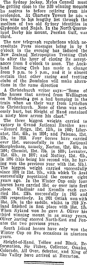The Sydney jockey, Mylcs Connell must bo getting cloBO to the 1000 winning mounts ho aspires to before retiring From his profession, At Gharwra Towers ho ado u two wins to his lengthy list through the medium of two old Sylney identities in Clydesido und Nojah. In the North Queenslaud Derby his mount, Persian Gulf, wus third. Tho new telegraph regulations which necessitate Press messages helng in by 9 o'clock in the evening has Induced the New Zealand Metropolitan Trotting Club to alter the hour of closing its acceptances from 8 o'olook to noon. The Auckland Racing Club has made a, change from 9 p.m. to 5 p.m., and it ie almost certain that other racing and trotting clubs of tho Dominion will inako alterations in the same direction A Ghristchurch writer says:—"Some of the horses that arrived from Wellington on Wednesday got a bad bumping in tho tram when on thciv way from Eyttelton to Christchurch. None of them was seriously hurt, but Sleight of Hand sustained a nasty blow across his chest." •The three biggest weights carried to victory in Grand National Hurdles are: -Becorcl Heign. 12st. 121b.. in 1900; Liberator, 12st. 61b., in 1894; and Paisano, 12st. lib., in 1910. I'our horses have carried over 12st. successfully hi the Niitioual Steeplechase, namely, Norton, 12et. 81b., in 1894; Chemist, 12st. 71b. in 1889; Levanter, 12st. 61b., in 1897; and Mutiny, 12st. lib., in 1896 (this being his second win, he having won tho previous year with list. Mb.). Tho biggest weight carried successfully since Vm is list. 91b.. with which Tc Arai successfully negotiated tho course eight years ago. Iu the Winter Cup only four horses have carriod 10st or over into ilret place. Vladimir and Kremlin each carried 10st. 121b. Eiio:essfully in 1903 and 1905 respectively. In 1901 Ostiak won with 10st. 51b. iu the saddle, whilst in 1910 Nvland finished iu flret place with 10st. lib. When Nyland won ho gave A. Oliver liia third winning mount in as many years, Oliver having steered North-East and Penates the two previous years. South Island horses have only won the Winter Cup on ilvo occasions in niuetceu years. Sleight-of-Haml. Yellow and Black, Ecformation, Sir fisher. Collector, Omaliu Colorado, All Over, Selector, and King of the- Valley have arrived at Kiccarton!