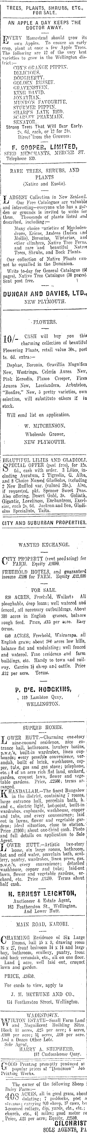 TREES, PLANTS, SHRUBS, ETC, FOR SALE. AN APPLE A DAY KEEPS THE DOCTOR AWAY. EVETJY Homestead should grow its own Apples. To ensure an early crop, plant «t once a feu- Apple Trees. 'Dip followiiiß are 12 of the very best varieties to grow in tho Wellington district :- COX'S n'RA'NOE I'IPPIN. DKWCIOUS. DOUGHERTY. GOLOEX RUKSET. CiRAVENSTCTN. KING IiAVTD. JONATHAN. MUNKO'S FAVOURITE. STUIOfF/K PIPPIN. HTUBP'S LATK RED. KCATfi.fi" riUUMAIN. SENATOR. • Strong Trees That Will Bear Early, k Oil. mcli, or'l2 for 21s. Diroc(~from tho. Growers: F. COOPER, LIMITED, i Srai.) MrTrtCTfANTS, MTuROiJR- ST. ; Telophnne 839. RAKE TREES, SHRUBS, AND PLANTS (Native and Exotic). ' J ABGI3ST Collection in New Zealand. ! -«-J Our I'reo Catalogues are valuable and interesting—everyone who has a s»rden or grounds is invited to write for them. Thousands of plants listed and described, including:— Many choice "arieties of HJip-.loden-d rons, Ericas, Araleas (Imliea .'.nd Mollis), Boronias, Wistarias, and other climbers, Native Tree Ferns, and rare 'and beautiful Native Trees, Shrubs, and Rock Plants. Our collection of Native Plants cannot b? equalled in tho Dominion. Write to-day for General Catologuo 160 pages), Native Tree Catalogue (30 paces). Went post free. \ DUNCAN AND DAVIES, LTD., NEW PLYMOUTH. ' • PLOAVERS. ia/_ CASH will buy you this charming collection of beautiful Flowering Plants, retail value 305., post Is. 6d. extra:— Daphne, Boronia, Gravillia Magnifies New, Westringtt. Celeria Anreii New, Pint kenedia, Flame Creeper, Fjcca Azurea Now, Lassiandora, Arbutelou, ■ "Bonfire," New, 5 pretty varieties, own selection, will substitute others if in stock. Will send list on application. W. MITCHINSON, Wholesale Grower, NEW PLYMOUTH. ' BEAUTIFUL LTLTES <VND GLADIOLI. SPECIAL OFFER (post free), for IDs. Gd., cash with order. 3 Lilies, in-'> eluding Auratum, 2 Tigredia, G. Alba, and 8 Choice Named Gladiolas, including 2 New Ruffled var. (valued 20?.). Also, if requested, plrt. Spencer Sweet "Peas. Also offering, Desert Gold, 3s. Goliath, ; Gigantic, Loveliness, Enchantress, Excpjj sior, each 2s. 6d. Jackson and Son, Gladij olus Specialists, Taita. CITY AND SUBURBAN PROPERTIES. WANTED EXCHANGE. fiWY PROPERTY (rent prodacing) for V> FARM. Equity .£9OOO. FREEHOLD HOTELS, and guaranteed income .£SOO for FARM, Equity £12,000 FOR SALE. 820 ACRES, Freehold. Wailtnti All' ploughable, deep loam; well watered and fenced, all necessary outbuildings. About 300 acres in English grasses, balance lough feed. Price, Mo per acre. Kasy cenns. GW ACRES, Freehold, W.iirarapa. all English grit v<; about SfO arres low hills, balance flat and undulating) well fenced and watered. Fino lcsitlenco and farm buildings, etc.. Handy to town <tud railvny. Carries 11 eh:»p and cattle. Price ,£l2 per acre. Terms. P. D'E. HODGKINS, t HO Lambton Quay, ' WELLINGTON. 'SUPERB HOMES. T OWER HUTT.—Charming one-story ■Li nine-roomed residence, nice entrance hall, bathrooms, lavatory basins, p.w.c.'s, built-in wardrolxis, linen cup- I boards; every possible convenience, verandah, built of brick, washhouso, copper, tubs, gas nnd sns stove; telephone, etc.; I of an acre rich Jlat land, orchard, i "arden, croquet lawn, flmver and vege- > table gardens. Price, .£2500; terms ar- j K'HANDALLAH.-Tlic finest Bungnlow ! in tho district, containing 7 rooms, j large entrance hull, porcelain bath, h. ■ and c, electric light, hot-point, built-in ; wardrobes, cupboards, woshhouse, copper . and tubs, and every convenience; laid : out in lawns, flower ami vegetable gar- \ dens; idp.i) situation, close to 6tation.'. Price .£1900; about one-third cash. Photo and full details on application to Solo j Agent. ' I I OWER HUTT.-Artistic two-story | Ji home, six largo rooms, bathroom, | hot and cold water, porcelain bath, scnl- j lery, pantry, wardrobes, linen press, gas, p.w.c.'s, every convenience; detached washhotise, copper and tubs; laid-ont lawn, flower nnd veßetnble gardens, orchard, etc. Price JMSOO. Terms about half cash. h. ernestTeichton, Auctioneer & Estate Agent, 162 Featherston St., Wellington, And Lower Hutt. MAIN ROAD, KARORI. (CHARMING Residcnco of Six Large ■> Rooms, hall IS x !), drawing room K x 27, trout bedroom 14 x U nnd Inrge buy, bathroom, scullery, pantry, front and back verandah, etc., all on one floor. Land 1 acre, well laid out, croquet lawn and garden. .PRICE, iClfeO.. For cards to view, apply to ,T. If. UETHUNE AND CO., 151 Featherslon Street, Wellington. WADESTOWN. W'ILTON KSTATIi-Small Farm Land ami Jlnsiiificcnt Huilding vSites. Block 11 acres, i!2."i per acre; t acres, ,£IOO per acre; 5J acres, J:(i0 per aero. And a Dozen Other-Lois. Sole Agent, HARRY A. SHEPITEI!D. 11l Customhouse Quay. GOOD Printing promptly produced 81 piipiiliir inices tit "Dominion" .lob i'riEting Works. Tho owner of the following Sheep li Dairy Farm:— A Ap ACHI'jS, all in-good grass, about '-iAfO iliiliiting; 7 paddocks, post ai sfrtamsi'i'arryiiijf W0 nhmm, V cows, Lvs :)-rooineif cottase, di.]), yards, etc., etc.; i church, etc., i\ miles; good motor roi Price, X2l per aero; Equity, .£2500. CJLCHBIST i SOLE AGENTS, PA]