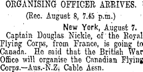 ORGANISING OFFICER ARRIVES. : (Rec. August 8, 7.45 p.m.) New York, August 7. Captain Douglas Nickle, of - the Royal Flying Corps, from France, is going to Canada. Ho said that the British War Office will organise the Canadian Flying Corps.—Aus.-N.Zj Cable A6sn.