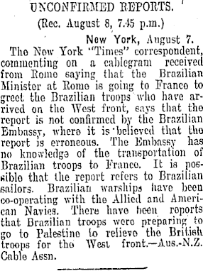 UNCONFIRMED DEPORTS. ' (Rec. August 8, 7.45 p.m.) New York, August 7. Tho Now York ''Times" correspondent, commenting on a cablegram received from Romo saying that tbo Brazilian Minister at Romo is going to Franco to greet the Brazilian troops who have arrived on tho West front, says that the report is not confirmed by the Brazilian Embassy, where it is ■believed that tho report is erroneous. The Embassy has no knosvledga of the transportation of Brazilian troops to Franco. It is possible that the report refers to Brazilian sailors. Brazilian warships have been co-operating with the Allied and American Navies. There have been reports that Brazilian troops woro preparing to go to Palestine lo relievo tho British troops for tho Wesl front.—Aus.-N.Z. Cable Assn.