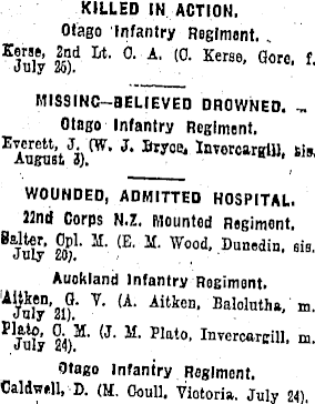 KILLED IN ACTION. Otago Infantry Regiment.. Kerse, 2nd It. 0. A. (0. Kerse, Gore, f uujy 3oj. MISSINC-BELIEVED DROWNED. Otago Infantry Regiment. *Xxtgah 3 i) m ' J ' Bry ° B ' lnT6rcar «tW' * iBWOUNDED, ADMITTED HOSPITAL. 22nd Corps N.Z. Mounted Regiment. Opl. M. (E. M. Wood, Dunedin, sis. July ztt). ' , Auokland Infantry Regiment. V ' (A " AitkoD ' Balolnth »- '»•' V Juty 24) M- <J- M- Plato ' InTercar eill. m. Otago Infantry Regiment. CaldwdL D. (H. Ooull. Viotoria. July 24).