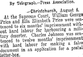 By Teksrapli.—Press Association. — Christchurch, August 8. At the Supreme Court, William George Price and Ella Elizabeth Price were sentenced to six months' imprisonment without hard labour for harbouring a military deserter. Charles Johnson was sentenced to twelve months' inipnsonment with hard labour for making a fnUo document in an application for a postal lettor-box. ___^__