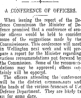 •A .CONFERENCE OF OFFICERS. When issuing the report of the Defenco Commission the Minister of Defence promised that a conference of senior officers would be held to consider some of the suggestions made by the Commissioners. This conference will meet in Wellington next week and will prepare a report for the Minister regarding various recommendations put forward by the Commission. Some of the recommendations may be approved; others (bTtoinly will be opposed. The officers attending the conference will be the district commam.antt !md the heads of the various -brancues- of t : ,c Defence Department. They are likely- ta sn for some days.