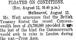 FLOATED ON CONDITIONS. (Rec. August 12,10.40 p.m.) Melbourne', August 12. Mr. Watt announces that the British Treasury floated tho recent Commonwealth loan of i 11,750,000 provided ;it the last of tho kind tho Commonwealth would seek to raiso in London during the war—Press Assn.