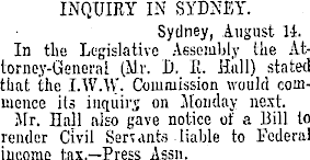 INQUIRY IN SYDNEY. Sydney, August U. In the Legislative Assembly the At-torney-General (Mr. D. E. Hall) stated that the I.W.W. Commission would commence its inquiry on Monday next. Mr. Hall also gave notice of a Bill to render Civil Sen ants liable to Federal income tax.—Press Assn.
