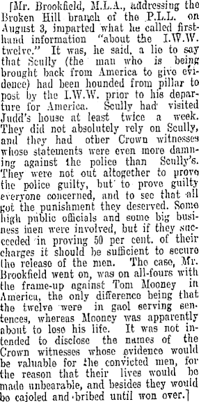 rJIr. Brookfield, M.L.A., addressing tho Broken Hill branch of tho P.L.L. on August 3, imparted what he called firsthand information "about the I.W.W. twelve." It was, he said, a lio to say that Scully (the man who is being ■brought back from America to (jivo evidence) had been hounded from pillar to post by the I.W.W. prior to his departure for America. Scully had visited Jmld's house at least twice a week. They did not absolutely rely on Scully, and they had other Crown witnesses whose statements were even more damning against the polico than Scully's. They were not out altogether to provo the police guilty, but' to provo guilty everyone concerned, and to sec that all got the punishment they deserved. Some high public officials and some big business iuen were involved, but if they .succeeded in proving 50 per cent, of their charges it should be sufficient to secure Iho releaso of the men. Tho caso, Mr. Brookfield went on, was on all-fours with the frame-up against Tom Mooney in America, the only difference being that tho twclva were in gaol serving sentences, whereas Mooney was apparently about to loso his life. It was not intended to disclose the names of the Crown witnesses whose evidence would be valuable for ilie convicted men, for the reason that their lives would bo mado unbearable, and besides they would bo cajoled and 'bribed until won over.]
