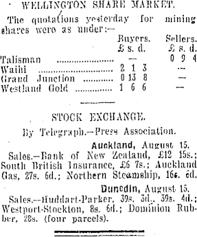 • WKMjTNGTON B.HARR JfAHKF.T, The quotations ynnierday for mining shares wci'o as under:— Buyers. Sellers. £ S. (1. £ P. il. Talisman — 0 9 4 Wailii 2 13 Grand Junction 013 8 — ■ Westland Gold 16 6 — STOCK EXCHANGE, liy Toli'L'i'apli.—Pre?H Association. AUiikland, August 15. Sales-Hank of New Zealand, £12 155.; South Urilish Insurance, £6 75.; Auckland' Gas, 275. 6d.; Northern Steamship, 16t. cd. Duncdin, August 15. Sales.—Huddart-l'arker, 395. 3d.. 395. 4d.; Westpoi't-Stocklon, Bs. 6d.; Dominion Rubber, 28s. (four parcels).