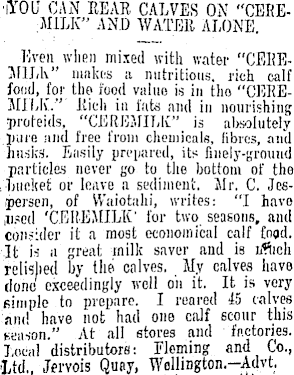 iYOU CAN REAR CALVES ON "CERE ;MILK" AND WATER ALONE. Even wlifiii mixed with water "CEREJULU" makes :i nutritious, rich calf food, for the rood value is in tlio "CEREJIILIv." Rich in fats and in nourishing proreids, "CERBJULK" is absolutely ))iue find free from chemicals, fibres, and li!i.-iic3. Easily prepared, its finely-ground particles never go to the bottom of the •.l)iie!tet or leave a sediment. Mr. C. Jesipersen, of VV'aiotahi, writes: "I have ,1150(1 'CEHEMILK' for two seasons, and consider it a most economical calf £ngd. It h a great milk saver and is itfich relished by the calves. My calves have done exceedingly well oil it. It is very simple to prepare. I reared 45 calves am! have not had one calf scour this eeuson." At all stores and factories. Local distributors: Fleming and Co., 'Ltd., tovois Quay, Wollington.-Advt.