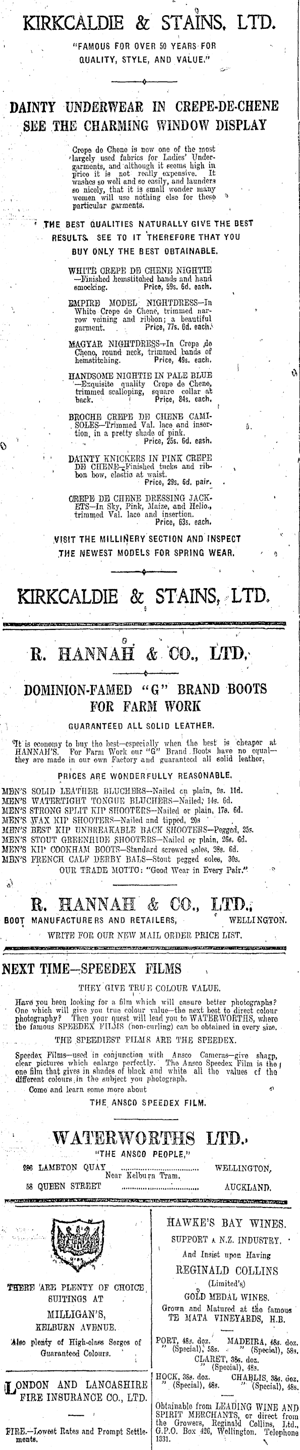 KIRKCALDIE & STAINS. LTD. "FAMOUS FOR OVER 50 YEARS FOR QUALITY, STYLE, AND VALUE." 0 DAINTY UNDERWEAR IN CREPE-DE-CHENE SEE THE CHARMING WINDOW DISPLAY ■ ■ ■ ■ ■ ■ ■ Crope do Chene is now one of the most 'largely used fabrics for Ladies' UnderKarmdnts, and although it eeoins high in price it 18 not really expensive. It washes so woll and so easily, and launders so nicoly, that it is small wonder many • , , , . women will nso nothing else for thesO a particular garments. ( '■".""' THE BEST QUALITIES NATURALLY GIVE THE BEST RESULTS. SEE TO IT THEREFORE THAT YOU BUY ONLY THE BEST OBTAINABLE. WHITE CREPE DE CHENE NIGHTIE —Finished hemstitohed bands and hand emocking. Price, 595. 6d. each. EMPIRE MODEL; NIGHTDRESS-In Whito Crepe de Chene, trimmed nar- ♦ row voining and ribbon; a beautiful garment. Price, 775. 6d. each. 1 MAGYAR NIGHTDRESS-rln Crepe jae ' ■• Ghono, round neck, trimmed bands of hemstitching. Price, 495. each. HANDSOME NIGHTIE IN PALE BLUE ' '—Exquisite quality Crepe de Chene, trimmed scalloping, square collar at back. i Price, 84s. each, i BROCHE CREPE DE CHENE CAMI- . SOLES—Trimmed Val. lace and inser- r, ' ■ tion. in a pretty shade of pink. p. '' . •■ , ' . Price, 255, 6d. eash. . j '.' DAINTY KNICKERS IN PINK CREPE } , t DE CEIENE-rFinished tucks and rib- ■ , boil bow, elastio at waist. Price, 295. 6d. pair. . OREPB DE CHENE DRESSING JACKETS—In Sky, Pink, Maize, end Helio., trimmed Val. lace and insertion. Prico, 635. each, VISIT THE MILLINERY SECTION AND INSPECT THE NEWEST MODELS FOR SPRING WEAR. ' o e— ; — KIRKCALDIE & STAINS, LTD. • ■ -.J ' .mi . R. HANNAH &/GO., LID, -4 : DOMINION-FAMED "G" BRAND BOOTS FOR FARM WORK ', GUARANTEED ALL SOLID LEATHER. °It is economy to buy tho best—especially when the best is cheaper at HANNAH'S. For 'Farm Work our "G" Brand. Boots have no equal— they aro made in our own Factory and guaranteed all solid leather. PRICES ARE WONDERFULLY REASONABLE. MEN'S SOLID LEATHER BLUCHEtRS-Nniled on plain, 9s. lid. MEN'S WATERTIGHT TONGUE BLUCHERS-Nailed, 1 Us. 6d. MEN'S STRONG SPLIT KIP SnOOTERS-Nailed ov plain, 17a. 6d. MEN'S KIP SHOO'I'ERS-Nailed and tipped, 20s ' MEN'S BEST KIP UNBREAKABLE BACK SHOOTERS-Pegged, 255. MEN'S STOUT GREENHIOE SHOOTERS-Nailod or plain, 26a, fid. MEN'S KIP COOKHAM BOOTB-Standard screwed soles, 38s. fid. . MEN'S FRENCH CALF DERBY BALS-Stont pegged soles, 30a. OUR TRADE MOTTO: "Good Wear in Every Pair." p R. HANNAH' & CO., LTD.; BOOT MANUFACTURERS AND RETAILERS, * WELLINGTON. • ' WRITE FOR OUR NEW MAIL ORDER PRICE LIST. .■MllJLlllin^lllfllirWlP I »'WP' l 'l" l^'ll Tr' l '^'' r *r ra 7 ww * l 'T" JII ' u ' l '^^fMl ul]^Wt '" l '' w " l] "'" ,ll " MJ, T'^»H'-VI^FP' t] 'l NEXT TIME-SPEEDEX FILMS ' , THEY GIVE TRUE COLOUR VALUE. i • Hare'you bnon looking for a. film which will ensure better photographs? One which will give you true colour value—the next best to direct colour photography P Then your quest will lead you. to WATERAVORTHS, wJiero '.." the famous SPEEDEX FILMS (non-curling) can bo obtained in every size. ....... THE .SPEEDIEST FILMS ARE THE SPEEDEX. Speedex Films—used in conjunction with Ansco Cameras—give shajp, clear pictures which enlarge perfectly.' The Ansco Speedex Film is the | one film that gives in shades of block and white all tho values cf tho. . different colours ; in the subject you photograph. . Come ajid learn, some more about . THE, ANSCO SPEEDEX FILM. WATERWORTHS I/TO.. "THE ANSCO PEOPLE," 586 LAMBTON QUAY WELLINGTON, Near Kelburn Tram, 58 QUEEN STREET .' ;,.„ AUCKLAND. . JTiL?ft? '' HAWKE'S BAT WINES. SUPPORT k N.Z. INDUSTRY. •' And Insist upon Having ,7 Sp*f • REGINALD COLLINS THERE 'ARE PLENTY OF CHOICE „ < Limited,! i) SUITINGS AT . ' GOLD MEDAL WINES. TTTn . w)O Grown and Matured at tno famous MILLILtAN b, . TE MATA VINEYARDS, H B KELBURN AVENUE. Also plenty of High-olass Serges of PORT, 483. doz.' MADEIRA, 48s. doz. Guaranteed Colours. ' , (Special), - " (Special), 58s. CLARET, 38s. doz. I . _ ; , " (Speoial), 48s. HOCK, 38s. doz. CHABLIS 88s. uoz., jJONDON AND LANCASHIRE ". (Special), 48s. " '(Special), «s.' FIRE INSURANCE CO., LTD. —, Obtainable from LEADING WINE AND ' SPIRIT MERCHANTS, or direct from the Growers, Reginald Collins, Ltd., FIRE.-Loweat Rates and Prompt Settle- G.P.O. Box it2C, Wellington. Telophona ments. 1331. N