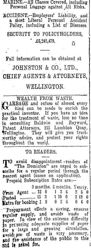MARINE.—AU Classes Covered, including : Personal Luggage against Risks. 'ACCIDENT.-Employers' Liability, and a most' Liberal Personal Accident Polioy, including a List of Diseases. SECURITY TO POLICYHOLDERS, ' 46,249,479. q Pull information can be dbtained at j , JOHNSTON k CO.', LTD., DHIEF AGENTS & ATTOENEYS, WELLINGTON. WEALTH FROM WASTE. IHABBAGE and rel'uao of almost every (VX kind can be made to enrich the practical inventor. If you have an idea for the treatmont of -waste, loso no timo in consulting Baldwin and Eayward, Patent Attorneys, 215 Lambton Quay, Wellington. They will fiivo you tnist.worthy advice, and protect your rights throughout tho Tvorltl. TQ READERS. TO nvoid disappointment -readers of "The Dominion" aro urged to subwribe for a regular period through, the pearest agent (name on application). Prepaid Subscription Raffs are-.— 3 months. C mouths. Yearly. iPmm Agent ••• 12 0 13 6 2 0 0 .pouted 15 3 !,0 ° 2 19 « fetra fw booking 2 0 0 2 C 0 C 0 -''Prepayment effects a saving, ensures tsgtilar supply, and avoids wasto of paper. In view of tho cxtremo difficulty jn prcinring adequate supplies of paper for b ■ large and growing circulation, avoid! JM> of waste is very necessary,» ind tke'assistance of the public to this; t>nd it juked fa* t