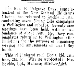 Tho TCov. E Palgravo Davy, superintendent of tlio New Zealand' Children's Mission, has returned to Auckland after conducting ecvcii Young Life campaigns in Wellington and suburbs, Seventy-nine meetings have been held, with lin attendance of about 1700. Mr. Davy contain plates roturning to Wellington after Christinas for the purpose ot organising service and amusements on Lyiill liny bt.vub. ! This will interest you.' Boots, kid, 255.; .' hide, 21s. Gd, Why go wet-footed? Geo. t Fowlds, Ltd., Manncre Streot.^-Advt,