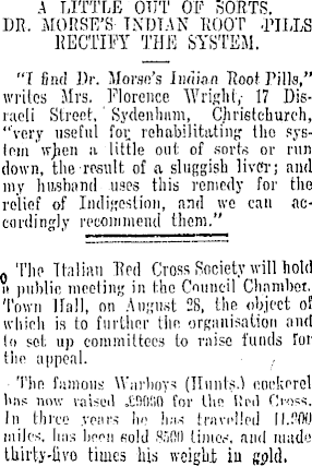 A LITTLE OUT OP SORTS. DR. MORSE'S INDIAN ROOT .PILLS IiECTIFY THE SYSTEM. "I find Dr. Morse's Indian Root Pills,**, wrilcs Mrs. Florence AYrighty 17 Disraeli Street,' Sydenham, Christchurch, "very useful foi; rehabilitating the syslem'wjien a little out of sorts or run down, the-result of a sluggish livCrj and my husband uses this remedy for the relief of Indigestion, and we can accordingly recommend them." 0 The Italian Red Cross Society will hold a public meeting in the Council Chamber. Town Hall, on August 28, the object of which is to further the organisation and lo sot up committees to raise funds for the appeal. The famous Warboys (Hunts.) cockerel lias now raised .cnnftO for the I'pil Cross. In three years lie has travelled ll.PflU miles, has been sold .SSOII time.-, and made : tliirty-fivo times his weight; in gpld.