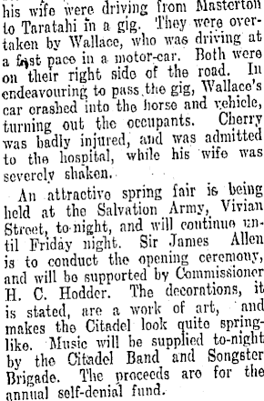 his wife were, driving from Masterton to Taratahi hi a gig. They ■were overtaken by Wallace, who was driving at a fast pace in a motorcar. Both were on their right side of the road. In endeavouring to pass .the gig, Wallace s car orashed into the iiorse and vehicle, turning out the occupants. Cherry was badly injured, and was admitted to the hospital, while his wife was severely shaken. An -attractive spring fair being held at the Salvation Army, Vivian Street, tonight, and will pontinuo until Friday night. Sir James Allen is to conduct tho opening ceremony, and will bo supported by Commissioner H. C. Hoddcr. The decorations, it is stated, are a work of art, and makes tho Citadel look quite springlike. Music will be supplied to-night by tho Citadel Band and Songster Brigade. The proceeds are for the annual self-denial fund.