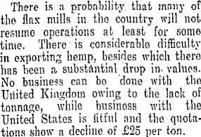 There is a probability that many of the flax mills in the country will not resmno operations at least for some time. There is considerable difficulty in exporting hemp, besides which there has been a substantial drop in. values. No business can bo done with the United Kingdom owing to the lack of tonnage, while business with the United States is fitful and the quotations show a decline of £25 per ton.