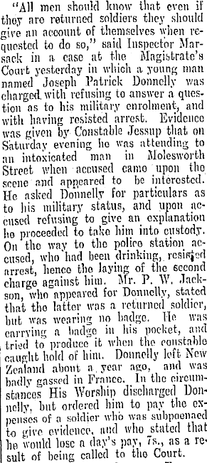 "All men should know that even if they are returned soldiers they should give an account of themselves lvhen requested to do so," said Inspector Marsnek in a case at the Magistrate's Court yesterday in which a young man named Joseph Patrick Donnelly was charged, with refusing to answer a question as to his military enrolment, and with having resisted arrest. Evidence was given by Constable Jessup that on Saturday evening ho was attending to an intoxicated man in Molesworth Street when accused camo upon tho scene and appeared to bo interested. Ho asked Donnelly for particulars as to his military status, and upon accused refusing to give an explanation he proceeded to tako him into custody. On tho way to the police station accused, who'had been drinking,.resided arrest, hence tho laying of tho 6ccond charge against him. Mr. P. W. Jackson, who appeared for Donnelly, stated that tho latter was a returned soldier, but was wearing no badge. tfn was carrying a Imdgo in his pocket, and tri"d to produce it when the constable oaimht hold of him. Donnelly loft New Zealand about a, year ago, and was badly gassed in Franco. In the circumstances His Worship discharged Donnelly, but ordered him to pay tho expenses of a soldier who was subpoenaed to give evidence, and who stated that lie would lose a day's pn>'i 75., as a result of being called to tho Court.