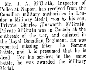 Mr. J. A. M'Grath, Inspector of Police, at Napier, lias received from the Canadian military authorities in London a Military Medal, won by his son, Private Chiirlps jUnsworth M'Grath. Private M'Grath was in Canada at the outbreak of the war, and enlisted in the Royal Canadian Regiment. He was reported missing after the Somnie battle, and it is presumed that he is dead. For bis services in the same battle, he was awarded the Military Modal.