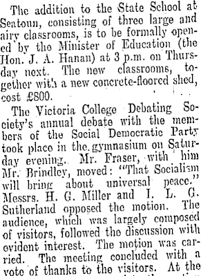 The addition to the State School at Seatoun, consisting of threo large alia airv classrooms, is to be formally opened'bv the Minister of Education (the Hon." J. A. Hanan) at 3 p.m. on ihursday next. The new classrooms, together with a new concrete-floored shed, cost £800. ' '' ■ ■ Tho Victoria College Debating Society's annual debate with the members of the Social Democratic Party took placo in the. gymnasium on Saturday evening.. Mr. Frnser, with, him Mr. , Brindlcy, moved: "That Socialism will brine about universal peace. Messrs. H. G. Miller and I. L. OSutherland opposed the motion. Hie audience, which was largely composed of visitors, followed the discussion with evident interest. The motion was carried. The meeting concluded with a. voto of thanks to tho visitors. At the
