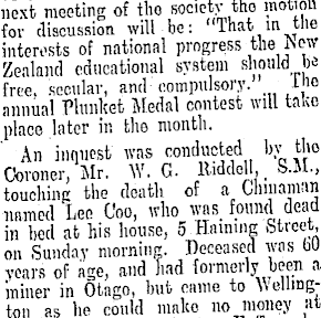 lexfc meeting of the society the motior tov discussion will be: "That in tin interests of national progress the Jsov Zealand educational system should ) free, secular, and compulsory. 1 " annual Pluntat Medal contest will tab place later in the month. An inquest was conducted by tlv Coroner, Mr. W. G. lliddoU, S.M. touching the death of a Chmanwi named Leo Coo, who was found deae in bed at his house, 5 Haming .Street on Sunday morning. Deceased was W years of age, and had formerly been i ininer in Otago, but came to Welling ton as he could make no money a