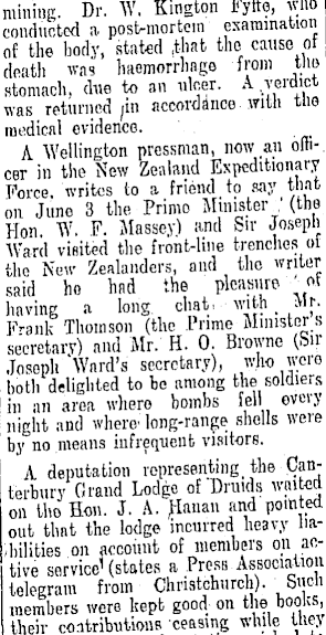 mining. Dr. TV. Kington Fyffe, who conducted a post-mortem examination of the hotly, stated .that the cause of 1 death was haemorrhage from the stomach, due to an ulcer. A verdict was returned jin accordance with tue medical evidence. A Wellington pressman, now an ofli-. cer in the New Zealand Expeditionary Force, writes to a friend.to say that on June 3 the Prime Minister (the Hon TV. F. Massey) and Sir Joseph Ward visited the front-line trenches oi the New Zealanders, and the writer said ho hnd the pleasure _ftf having a long, chat, with Mr. F-ank Thomson (the Prime Minister s secretary) and Mr. H. 0. Browne (Sir Joseph 'Ward's secretary), who were both delighted to be among the soldiers in an area where bombs fell every night and where long-range shells were by no means infrequent visitors. A deputation representing the Canterbury Grand Lodgo of Druids waited! on the Hon. J. A. Jianan and pointed out that the lodge incurred heavy liabilities on account of members on active sarviceHstotes a Press Association telegram from Christchurch). Such members were kept good on the books, their contributions ceasing while they