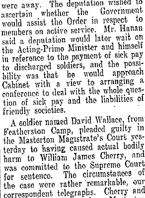 wero awav. Tho deputation wished to ascertain " whether the Government would assist tho Order in respect to members on active service. Mr. Hanan said a deputation would later wait on the Acting-Prime Minister and hraiselt in reference to the payment of sick pay to discharged spldiers, and the possibility was that he would approach Cabinet with a view to arranging a conference to deal with the whole question of sick pay and the liabilities of friendly societies. A soldier named David Wallace, from Featherston Camp, pleaded guilty m tho Masterton Magistrate's Court yesterday to having caused actual bodily harm to "William James Cherry, and was committed to tho Supremo Court for sentence The circumstances of the case wore rather 'remarkable, our correspondent telegraphs. Cherry and