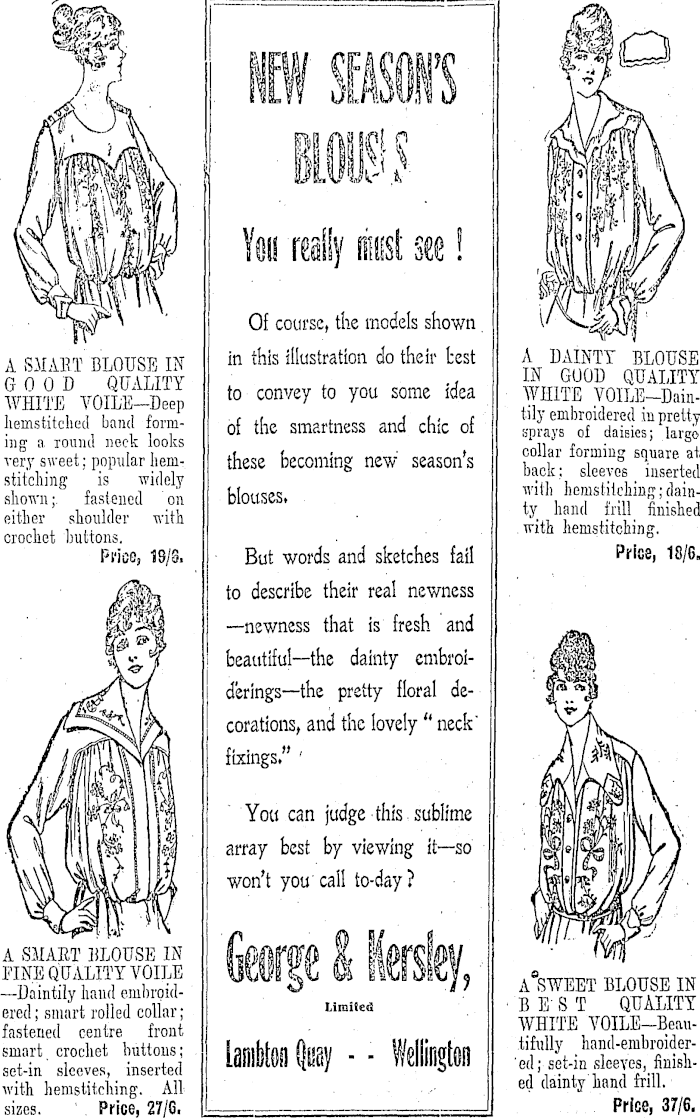 Wi IFSIf CfACORPC fc'StJ §.» Ill) Hfi\ Yh raly iiiil m ! M 1// V/ Of course, the models shown. I A SMART BLOUSE IN !in this illustration do their test A DAINTY BLOUSE annn ottatjtv .« iJN wjujj QUALITY WHITE VOILE-Deep to COnVey t0 yOU SOme ldea WHITE VOILE-Dain-hemstitched band W o{ the smartness and chic of J^^>?»£ ins a round neck looks n * ■ . ISSf ! T'"!S *~ *«-*«"•■ •—•■ £;= 6 =:j shown; fastened on ■ Mouses. with hemstitching ;daineither shoulder with %, h ? n(I }l xl }. fimslled crochet buttons. .Kith hemstitching. Price, 18/8. ■ But words and sketches fail 18/6. Js£fa to describe their real newness —newness that is fresh and *^ \%rj, beautiful—the dainty cmbroi- ; J®! d'erings—the pretty floral de- f corations, and the lovely " neck' V/V^ if) You can judge this,sublime ffifcTOHlV \ \ \\\ |lM *f a rfa y est ky viewing it—so ■ ffi e |%"p yj vv\ Ml\ JEI won't you'call to-day? t W,m/j ' A SMART BLOUSE IN £ iPfCPI/ . " <™T FINE QUALITY VOILE TOf |&CII MA MM, . °„ wvvrr m nTTC ™ TW -Daintily hand embroid- . *> ' ? iff'HS =£■ SSt E23 "ta toy ■ ■ Wellington ■||WS» with hemstitching. All ,• ed dainty hand frill, sizes. ' Price, 27/6. I- H Price, 37/6.