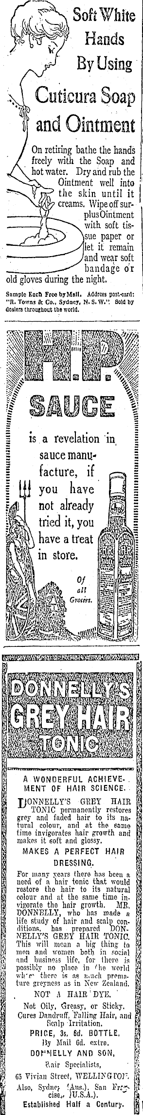 Soft White pFy; Hands /N/ s** By Using •vA Guticura Soap 1 and Ointment, / On retiring bathe the hands ' / freely rath the Soap and water. Dry and rub the . Ointment well into ■"' creams. Wipe off sur- _ plus Ointment ,—i v--~r^ v \ s s_ J sue P a P er or —■ *t remain 1 ■- J and wear soft bandage or old gloves during the night. Snmplo Encfi Free bjMall. Address post-cord: "R. Towns & Co., Sjrdoej, N. S. W.". Sold by dealers throughout the world. /fflSft | is a revelation in \ | sauce manu- I | facture, if. pa f I II you have _j i ?J1 not already £g;< s HI triedit »y° u JlLl Wm nave a treat Bw i * w f Ullll w I A WONDERFUL ACHIEVE- . 1 1 WENT OF HAIR SCIENCE. | i DONNELLY'S GREY HAIR | I TONIC permanently restores tjj, | grey and failed hair to its na- B I tural colour, and at the same K J time invigorates hair growth and fi i P makes it soft and glossy. | ' || MAKES A PERFECT HAIR | | DRESSING. I | For ninny years there has been a K | need of a hair tonic that would § ™ restore tho hair to its natural s colour and at the same time in- | vigorate tho hair growth. MR. fo DONNELLY, who has made n Hi life study of hair and scalp con- | ditions, has prepared DON. w NELLY'S GREY HAIR TONIC. | This will mean a big; thing' to » men and women both in social K>{ ft and business life, for there is ra I '4 possibly no place in 'ho world m I Iwh'f* there is as n.ach prenin- m ture greyncss as in New Zealand. §£ NOT A HAIR'DYE. ' 1 Not Oily, Greasy, or Sticky. Hfi Cures Dandruff. Falling Hair, and |j fiwilp Irritation. m PRICE, 3s. 6d. BOTTLE. || lly Mnil Gd. extra. Us ' DONNELLY AND SON, | 'Aair Specialists, • ?i I G5 Vivian Street, WELLINGTON |: w Also, Sydnej !Aus.), San Fr."r- Rt I | cisev JU.S.A.). * & 1 Established Half a Century. ||