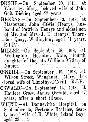 DICKIE.-On . September 20, 1915, at AVavefley. Mary, beloved wife of John Golt Dickie; aged 77 years. HENRYS-On 'September. 13, 1918, 'at Masterton; John ; Lewis'-Henrys, husband of Patricia Henrys and' eldest 6on of Mr..and Mrs..J. E." Henrys'; Thorn--<lon Quay, Wellington; aged 31 years. R.1.P.".- - .--.■' - ' MILLER.-On September/18, 1918, at Wellington . Hospital;'". Kate,.. .fourth ' daughter : of the late William Miller; of Napier. -~.'' '.'. '.".'.". . : '....'..-. CKNEILL.-On September .19, 1918, ,at Wilson Street. Wanganui, Mary, be-. ■ loved wife of Timothy-O'Neill. R.I.P. OSWALDr-On September- 14, 1918, at Hautere Cross, James Oswald, aged .'47; years; after.a short illness.' WHITE;-At Dannevirke-.Hospital.' on September .15, Gertrude Beatrice, dearly loved wife of.-R.-While, Island Bay; aged 29 .....-..-. '