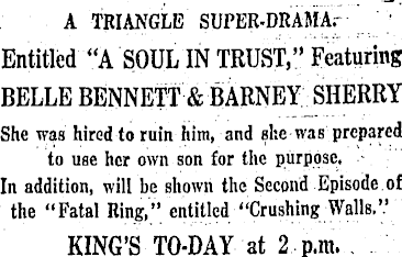A TRIANGLE SUPER-DRAMAr ' / Entitled "A SOUL IN TRUST," Featuring BELLE BENNETT & BARNEY _SHERRY She was hired to ruin him, and she was prepared to use her own son for the purpose. - In addition, will be shown the Second Episode.of the "Fatal Ring," entitled "Crushing Walls.'.' KING'S TO-DAY at 2 p.m. .