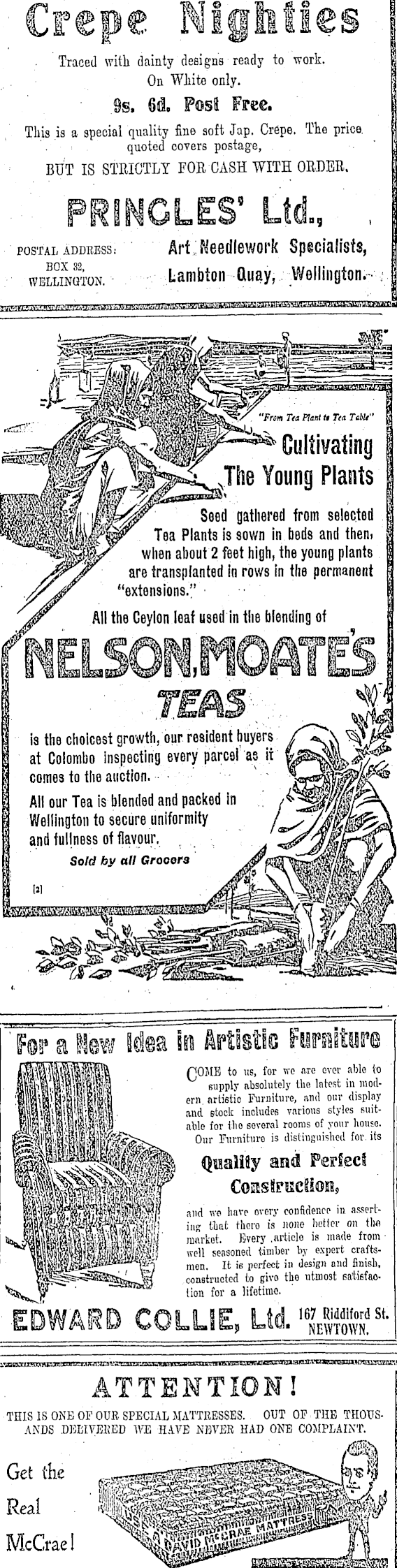 Traced with dainty designs ready to work. | On WJiite only. | .9s. 6fl. Post Free. | This is a special quality fine soft Jap. Cr6pe. The price. j quoted covers postage, ' BUT IS STRICTLY FOR CASH WITH ORDER. j postal address: Art .: Needlework Specialists, welSon. - v.Lambton Quay, Wellington,-,-. "From T<a Plant t» Tea Tchlt" \ Young Plants | BpttWl Seed 9 atliered from selec t fl d Tea Plants is sown in beds and then. wllßn about 2 ftet • h 'fl h » the y° un fl P ,antß I /srjr are transplanted in rows in the permanent j fljr "extensions." I Jr All the Ceylon.leaf used in the blending of ] is the choicest growth, our resident buyers | at Colombo inspecting every parcel' as it fo^SL^^. | comes to the auction. • ' ~ Etf*Moffl^ \ All our Tea is blended and packed in .' /^SflSfifrx \ Wellington to secure uniformity i^^jJEw^i. j and fullness of flavour, , , ■■ A ' For a Hew Ideata Artistic Furniture SPOME to us, for we arc over able to supply absolutely the latest in modem, nrlistio Furniture, and our display and stock includes various styles suitable for tho several rooms of your house. Our Furniture is distinguished for. its H| Qualifly and Perfect r ComstrucUon, P and wo have overy confidence in asswt- ')' in K that thoro is none hotter on tho \ market. Every .article is made from • j! well seasoned timber by expert craftsmen. It ie porfect in design and finish, constructed to give the utmost satisfaction for a lifetime. EDWARD COLLIE, Ltd■ "Bff st - ATTENTION I THIS IS ONE OF OUR SPECIAL MATTRESSES. OUT OF THE THOUSANDS DELIVERED WE HAVE NEVER HAD ONE COMPLAINT.