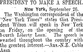 PRESIDENT TO MAKE A SPEECH. New York, September 26. The Washington correspondent of the ''New' York Times" states tliat President Wilson .will speak in New' York ■an Friday, on 'the opening of ..the Icurtb Liberty Loan; The speech is awaited throughout the country' with the greatest interest.—Aus.-N.Z'' Cable Assn., -