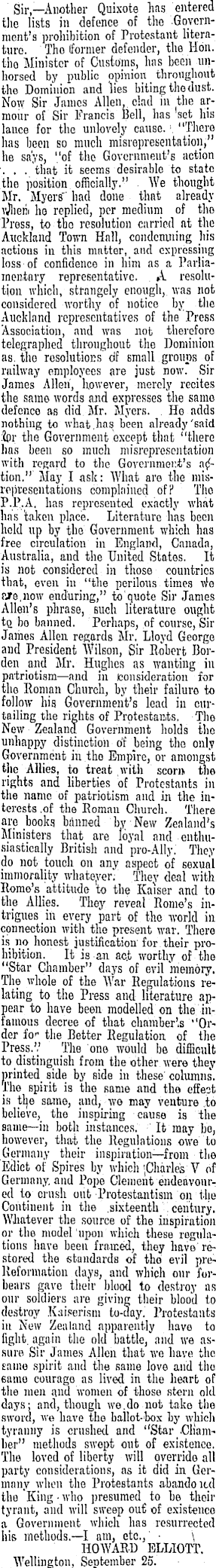 Sir,—Another Quixote has entered the lists in defence of the Government's prohibition of Protestant literature. Tho (former defender, the Hon. tho Minister of Customs, has been unhorsed by public opinion . throughout tho Dominion and "lies biting the dust. Now Sir James Allen, clad in the armour of Sir Francis Bell, has'set his lance for the unlovely cause.'. "There has been so much misrepresentation," he says, "of the Government's action . . . that it seems desirablo to state the position officially." . We thought Mr. Myers" had done that already vjlierii ho replied, per medium of the Press, to tbo resolution carried at the Auckland Town Hall, condemning his actious in this matter, and expressing loss of confidence in him as a Parliamentary representative. A resolution which, strangely enough, was not considered worthy of notice by the Auckland representatives of the Press Association, and was not therefore telegraphed throughout the Dominion as. tho resolutiocs df small groups of railway employees are just now. Sir James Alleii, however, merely recites the same words and expresses the same defence as did Mr. Myers. He adds nothing to what .has been already'said for the Government except that "there has been so much misrepresentation with regard to the Government's action." May I ask: What are the misrepresentations complained of? Tho P.P.A. has represented exactly what has taken place. Literature has been hold up by the Government which has free circulation in England, Canada, Australia, and the United States. It is not considered in those countries that, even in "the perilous times we we. now enduring," to'quote Sir James Allen's phrase, such literature ought to. bo banned. Perhaps, of course, Sir James Allen regards Mr. Lloyd George and President Wilson, Sir Robert Borden and Mr. Hughes as wanting in patriotism—and in (consideration for the Roman Church, by their failure to follow his Government's lead in curtailing the rights of Protestants. The New Zealand Government holds the unhappy distinction o'f being the only Government in the Empire, or amongst the Allies, to treat with scorn. Wie rights and liberties of Protestants in the name of patriotism and in the interests .of the Roman Church. There are books banned by New Zealand's Ministers that are loyal and enthusiastically British and pro-Ally. They do not touch on any aspect of sexual immorality whatever: They deal with Rome's attitude to the Kaiser and to the Allies. They reveal Rome's intrigues in every part of tho world in connection with the present war. There is no honest justification' for their prohibition. It is an ac.t worthy of the "Star Chamber" days of evil memory. The whole of the War Regulations relating to the Press and literature appear to have been modelled on the infamous decree of that chamber's "Order ftr the Better Regulation of the Press.',' The one would be difficult to distinguish from the other were they printed side by side in these columns. The Bpirit is the same and the effect is the same, and, we may venture to believe, tho inspiring cause is the same —in both instances. •" It may ho, however, that the Regulations owe to Germany their inspiration—from the Edict of Spires by which'Charles'V of Germany, and Pope Clement endeavoured to crush out Protestantism on the Continent in the sixteenth ■'. century. Whatever the source of the inspiration or the model upon which these regulations have been framed, they have' restored the standards of tho evil preRefonnation days, and which our forbears gave their blood to destroy as our soldiers are giving their blood to destroy Kaiserism to-day. Protestants in New Zealand apparently have to fight, again the old battle, and we assure Sir. James Allen that we have the same spirit and the same love and tho €ame courage as lived in the heart of the men and women of those stern old days; and, though we.do not take the sword, we have the ballot-box by which tyranny is crushed and "Star Chamber" methods swept out of existence. The loved of liberty will override all party considerations, as it did in Germany when the Protestants abandoitd the King • who presumed to be their tyrant, and will sweep out of existence a Government which has resurrected his methods.—l am, etc.,' • \ HOWARD ELLIOTT. Wellington, September 25.