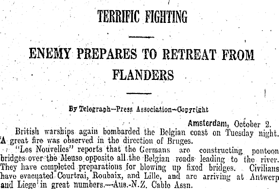 TERRIFIC FIGHTING ENEMY PREPARES TO RETREAT FROM FLANDERS .. . — . ' • ' .1 By Telegraph—Press iESociation-Oopyrislit Amsterdam, October 2. British warships again bombarded the Belgian coast on Tuesday night. 'A great fire was observed in the direction of Bruges. :i "Les Nouvellcs" reports that the Germans arc constructing pontoon bridg&s over-the Meuse,opposite all,the Belgian roads- leading to the river. They have completed preparations for blowing up fixod bridges. . Civilians have evacuated- Courtrai, Soubaix, and Lille, and are arriving at Antwerp and Liego'in great numbers.—Aub.-N.Z. Cable Assn.