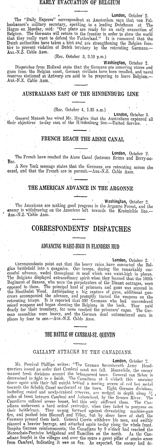 EARLY EVACUATION OF BELGIUM London, October' 2. The "Daily -Express" correspondent at Amsterdam says that von Falkenhausen's military secretary, speaking ,to a . leading Dutchman at The ■ Hague on Monday, said: "Our plans aro ready for an early evacuation of Belgium. The Germans will return to the frontier in. order, to show the world that they really want to defend the Fatherland." It is rumoured that the Dutch authorities have taken a hint and are strengthening tho Belgian frontier to prevent violation of Dutch territory- by tile retreating Germans.— Aus.-N.Z. Cable Assn. (Rec. October 3, 9.10 p.m.) Washington, October 2. Dispatches from Holland state that the Germans are removing stores and guns from the Belgian coast, German civilians have been recalled, and naval reserves stationed at 'Antwerp are said to be preparing to leave Belgium.— . Aus.-N.Z. Cable Asm.,., AUSTRALIANS EAST OF THE HINDENBURG LINE (Rec. October 4, 1.35 a.m.) >' ' London, October 3. _ General Monash has wired Mr. Hughes that the Australians captured all their objectives' to-day east of the Hindenburg line.—United Service. , FRENCH REACH THE AISNE CANAL , , , . ' London, October 2. Tho French have reached the Aisne Canal (between Reims and Berry-au- ' Bac. A New York message states that tho Germans, are retreating across the canal, and that the French are in pursuit—Aus.-N.Z. Cable Assn. THE AMERICAN ADVANCE IN THE ARGONNE .. . ' ' Washington, October 2. ■ 1 ho Americans are making good progress in the Argonno Forest, and the enemy is withdrawing on the American left towards the Kreimhilde line.— Aus.-N.Z.'Cable Assn.. CORRESPONDENTS' DISPATCHES ADVANCING WAIST-HIGH IN FLANDERS MUD . . London, October 2. ■ Correspondents point out that tho heavy rains i have convorted the Belgian battlefield into a quagmire. Our troops, during tho remarkably successful advance, waded throughout in mud which was waist-high in places. The Belgians displayed extraordinary spirit when they learned that the 100 th ■ Regiment of Saxons, who were, the perpetrators of the Dinant outrages, were opposed to-them. The principal haul of prisoners and guns was scoured in the Houthulst Wood. Anticipating a big capture of guns, additional guncrows accompanied the advance, and promptly turned the weapons: on tho retreating troops. It is reported that 500 Germans who had surrendered seized weapons'and began shooting the Belgians in the hack. Tlioy paid dearly for their troacliery, for -nono reached the prisoners' cages. The German casualties wero heavy, and the German dead outnumbered ours in places by four to one.—Aus.-N.Z. Cablo Assn. THE BATTLE OF CAMBRAI-ST. QUENTIN GALLANT ATTACKS BY THE CANADIANS. . ~ '. , i , London, October 2. Mr. Percival Phillips writes: "Th e German Seventeenth Armv Headquarters issued an order that Cambrai must not fall. Meanwhile, the enemy massed fresh divisions around tho beleaguered town. General von Below is determined to fight to a finish. Tho C! amu |i alls nfc.g o'clock this morning drove again with their full weight behind a nioving screen .of- red hut metul town ids tho Scheldt Canal northward of the town. Eight Gorman divisions, including rested and newly-trained reserves, aro wedged in depth nloii"- j'J „ miles of front between Cambrai and Anbenchcul, by the Seuseo River. * Canadians suffered severe losses, but this only stifFoued them. The Canadians underwent a hard ordeal yesterday, when t-liey failed to progress on their battlefront. They swung forward against devastating machine-gun fire, and pushed into Blecouft and Tilloy, but by. sheer force of shell the Germans pressed them back. General Currio withdrew his men, and swiftly planned a heavier barrage, and attacked again to-day along the whole front. Despite German reinforcements," the. Canadians by 9 o'clock had reached the Morencheis-Pontaire bridgehead and Ramillies on the north. As tho Canadians fought in the villages and over tho spurs a. great pillar of smoke arose from Cambrai, indicating it was on fire. As expected, the enemy had dc-
