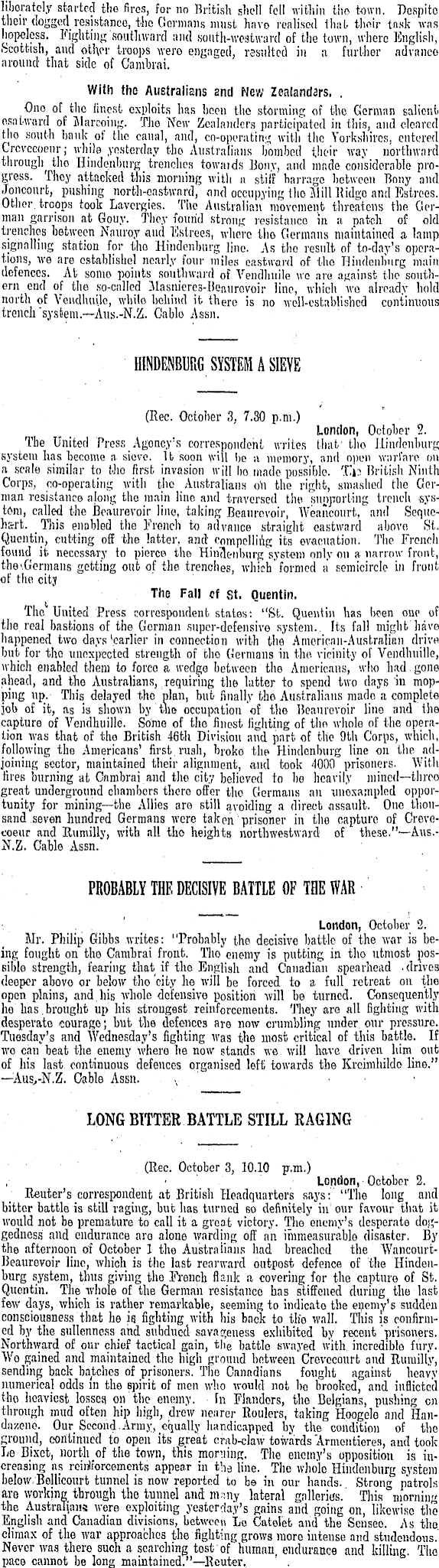 liborately started the fires, for no British shell fell within tho town. Despite their dogged resistance, the Germans must have realised that their tnslc was hopeless. Fighting southward and south-westward of the town, where English, Scottish, and other troops wero engaged, resulted in a further advance around that side of Cambrai. With the Australians and Mew Zcaiandars, , One of the finest exploits has been the storming of the German salient esntward of Marcoing. The New Zealamlcrs participated in this, and cleared tho south hnuk of the canal, and, co-operating with the Yorkshires, entered Crcvccoenr; while yesterday tho Australians bombed their way northward through tho Hindenburg trenches towaids Bony, and made considerable progress. They attacked this morning with a stiff barrage between Bony and Joncourt, pushing north-eastward, and occupying tho Mill Ridge and Estrees. Other, troops took Lavergies. The Australian movement threatens the German garrison at Gouy. They found strong resistance in a patch of old trenches between Nauroy and Estrees, where tho Germans maintained a lamp signalling station for tho Hindenburg line. As tho result of to-day's operations, we are establishel nearly four miles eastward of the Hindenburg main defences. At somo points southward of Veiulhuile we are against the southern end of the so-called Masnieres-Beaurevoir line, which wo already hold north of Veiidluiile, while behind it there is no well-established continuous trench "system.—Aus.-N.Z. Cable Assn. HINDENBURG SYSTEM A SIEVE (Rec. October 3, 7.30 p.m.) London, October 2. The United Press _ Agoncy's correspondent writes that- tho Hindenburg system has become a sieve. It soon will be a memory, and open warfare on a scale similar to tho first invasion will bo made possible. 'Hi: British Ninth Corps, co-operating with tho Australians oil the right, smashed the German resistance along tho main line and traversed the supporting trench system, called the Bea'urevoir line, taking Beaurovoir, Weaiicourt, and Sequch&rt. _ This enabled the French to advance straight eastward above St. Quentin, cutting off the latter, and' compelling its evacuation. The French found it necessary to pierce the Hindenburg system only on a narrow front, the\Germans getting out of the trenches, which formed a semicircle in front of the citj The Fall of St. Quentin. The United Press correspondent states: "St. Quentin has been one of the real bastions of the Gorman super-defensive system.. Its fall might have happened two days '.earlier in connection with the American-Australian drive but for the unexpected strength of tho Germans in the. vicinity of Vendhuille, which enabled them to forco a wedge between the Americans, who had gone ahead, and the Australians, requiring tho latter to spend two days in mopping up. This delayed the plan, but finally the Australians mado a complete job of it, as is shown by'tlie occupation of the Beaurovoir line and the capture of Vendhuille. Some of the finest fighting of the whole of the operation was that of tho British 46th Division and part of tlie 9th Corps, which, following tho Americans' first, rush, broko the Hindenburg line on the adjoining sector, maintained their alignment, and took 4000 prisoners. With fires burning at Cambrai and the city believed to be heavily mined—thrco great underground chambers there offer tho Germans an unexampled opportunity for mining—the Allies are still avoiding a direct assault. One thousand seven hundred Germans were taken prisoner in the capture of Crevetoeur and Rumilly, with all tho heights northwestward of these."—Aus.N.Z. Cable Assn. PROBABLY THE DECISIVE BATTLE OF THE WAR London, October 2. Mr. Philip Gibbs writes: "Probably the decisive battle of the war is being fought on the Canibrai front. Tho enemy is putting in tho utmost possible strength, fearing that if the English and Canadian spearhead • drives deeper abovo or below tho city he will be forced to a full retreat on the open plains, and his wliolo defensive position will be turned. Consequently he has.brought up his strougest reinforcements. They are all fighting with desperate courage; but tlie defences are now crumbling under, our pressure. Tuesday's and Wednesday's fighting was the most critical of this battle. If wo can beat the enemy where he now stands we will have driven him out of his last continuous defences organised left towards the Kreimhildo line." —Aus,-N.Z. Cable Assn. v LONG BITTER BATTLE STILL RAGING (Rec. October 3, 10.10 p.m.) ■ London, October 2. Keuter's correspondent at British Headquarters says: "The long and bitter battle is still raging, but has turned so definitely in' our favour that it would not be premature to call it a great victory. Tho enemy's desperate doggedness and endurance aro alone wardjng off an immeasurable disaster. By the afternoon of October 1 tho Australians had breached the WancourtBeaurevoir line, which is the last rearward outpost defence of the Hindenburg system, thus giving tho French flank a covering for the capture of St. Quentin. The whole of the German resistance haß stiffened during the last few days, which is rather remarkable, seeming to indicate the enemy's sudden consciousness that he is fighting with his back to tlio wall. This is confirmed by the sullenness and subdued savageness exhibited by recent prisoners. Northward of our chief tactical gain, tli e battle swayed with, incrediblo fury. Wo gained and maintained the high ground between Crevocourt and Rumilly, sending back batches of prisoners. The Canadians fought against heavy numerical odds m the spirit of men who would not bo brooked, and inflictcd tho heaviest losses* on'the enemy. In Flandors, tho Belgians, pushing cn through mud often hip high, drew nearer Roulers, taking Hoogelo and Handazene. Our Second.Army, equally handicapped by the condition of the ground, continued to open its great crab-claw towards 'Armontieres, and took Le Bixet, north of the town, this