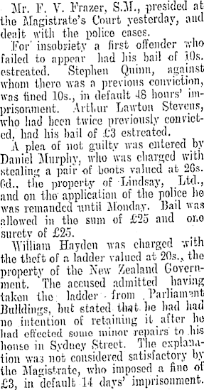 Mr. F. V. Frazer, S.M., presided at the Magistrate's Court yesterday, and dealt with the pnlico cases. For' insobriety a first offender who failed to appear had his bail -oF IDs. estreated. Stephen Quinu, against whom thero was a previous conviction, was fined 10s., in default 48 hours' imprisonment. Arthur Lawton Stevens, who had been twice previously convicted, had his bail of £'3 estreated. A plea of uot guilty was entered by Daniel Murphy, who was charged with stealing a pair of boots valued at 265. od.. the property of Lindsay, Ltd., and 011 the application of the police ho was remanded until Monday. Bail was allowed in the sum of £25 and ono surety of £20. William Ha yd en was charged *,vitn the theft of a ladder valued at 2n5... the property of the New Zealand Government. The accused admitted having taken the ladder - from . Parlianv-infc Buildings, but stated; that- he had had no intention of retaining it after he bad effected some minor repairs to .his house in Sydney Street. Hie explanation w:i;s not considered satisfactory by the Magistrate, who imposed a fino ot £3, in default 14 days' imprisonment.