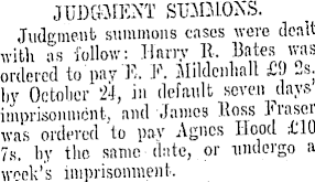 JUDGMENT SUMMONS. Judgment summons cases were dealt with as follow: liarrv 11. Bates was ordered to pay Mildciiliall £9 by October 24, in default seven days imprisonment, and James Ross yaser was ordered to pay Agnes Ilood £10 7s, by the same (late, or undergo a week's imprisonment.