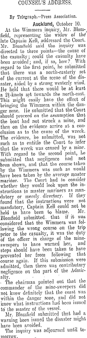 COUNSEL'S ADDRESS. By Tolegraph.—Press Association. Auckland, October 10. At the Wimmera inquiry, Mr. ]31om-, field, representing the widow of the" late Captain ICell, addressed the Court. Mr. Blomfield said the inquiry was directed to three points—the cause of the casualty; could the casualty have •been avoided; and, if so, how?, With regard to tho first point, he submitted that there was a north-easterly set of the current at the scene of the disaster, aided by a strong westerly wind. He held that there would be at least a 2J-kuote set towards the north-east. This might easily have the effect of bringing the Wimmera within the danger zone, lie submitted that the Court should proceed on the assumption that the boat had not struck a mine, and then on the evidence arrive at a conclusion as to the cause. of the wreck. The evidence, he submitted, was not such as to entitle the Court to infer that the wreck" was caused by a mine. With regard to the second point, he submitted that negligence had not neon shown, and that the course taken by the Wimmera was such as would have been taken by the average master mariiier. The Court had to consider whether they would look upon the instructions to master mariners as mandatory or merely. directory. If they found that the instructions were not mandatory, Captain Kell could not be held to have been to blame. Mr. Blomfield submitted, that if it was considered that tho Wimmera was following the wrong course on the trip prior to the casualty, it was tlie duty of the officer in charge, of the minesweepers to have warned her, and steps should have been taken to havo prevented her from following that course again. If this submission were admitted, then there was contributory negligence on tho part of the Admiralty. - ■ ■ The chairman pointed out that tho commander of the mine-sweepers did not know definitely that the coast was within the danger zone, and did not know what instructions had been issued to the master of tho vessel. Mr. Blomfield submitted that had a warning been issued the disaster might have been avoided. The inquiry was adjourned until tomorrow. .