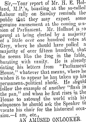 Sir,—Your' report of Mr. H. E. Holland, M.P.'s, boasting at the so-called Labour rally on Sunday reminds the public Unit they may expect some genuine amusement at the coming session of Parliament. Mr. Holland is so proud at being elected by a majority of a' little over one hundred votes at Grey, where he should have polled a majority of over fifteen hundred, that he seems like the frog in the fable, bursting with vanity. He is already dating his letters from "Parliament House," whatever that means, where he wishes it to appear he has taken up his permanent-political abode. He should follow the example of another "flash in the pan," mid when he first rises in the House to astound the world with his eloquence he should ask the Speaker to vacate his chair for the historical occasion.—l am, etc., AN AMUSED ONLOOKER.