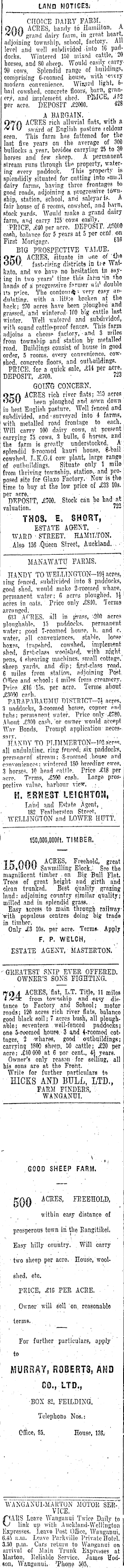 LAND NOTICES. CHOICE DAIRY FARM. ' OAA ACRES, handy to Hamilton. A AVU grand dairy farm, in gr«at heart, adjoining township, school, factory. All level and well subdivided into 16 paddocks. Wintered 150 mixed cattle,'2o horses, and 80 sheep. Would easily carry--90 cows. Splendid range of buildings, comprising 6-roomed house, with " e ' ;cl J modern convenience. Wiw'rd light, obail cowshed, concrete floors, er.v, and implement shed. PRICb, J52 per acre. DEPOSIT £2000. *28 A BARGAIN. 37 A ACRES rich alluvial flats, with .a • v sward of English pasture seldom i seen. This farm has fattened for the last five years on the average of 300 bullocks a year, besides carrying 25 to 30 horses and few sheep. A permanent stream runs through the property, watering every paddock. This property is splendidly situated for cutting into umi.Jl dairy farms, having three frontages to good" roads, adjoining a progressive town- , Bhip, station, school, and saleyarls. A fair house of 6 rooms, cowshed, and b.un, stock yards. Would make a grand dairy farm, and carry 125' cows easily. PRICE, £40 per acre. DEPOSIT. £5000 cash, balance for 5 years at 5 per cent, on First Mortgage. ' f" BIG PROSPECTIVE VALUE. OKA ACRES, situate in une of 'the 00\j. fnst-risir.g districts in tie Waikato, and wo have no hesitation in saying in two years' time this fa ha v in iho hands of a progressive farmer «ii' double Us p'ice. The very easy undulating, with a.litHe broken at the back; 270 acres have been ploughed and grassed, and wintered-100 big cattle last winter. Well watered and subdivided, with sound cattlo-proof fence?. This farm adjoins a cheese factory, ■ ami 3 miles from township and station by metalled road. Building consist of house in good order, 5 rooms, every convenience, cowshed, concrete floors, and outbuildings. ' PRICE, for a quick sale, Mi per acre. DEPOSIT, £700. ? 23 GOIJTG CONCERN. OKA ACRES rich river flats; MO acres OOV been ploughed and sown down in best English pasture. Well fenced and subdivided, and'surveyed into t farms, with metalled road frontage to each. Will carry 100 dairy cows, at present carrying 75, cows, 3 bulls, G horses, and the farm is greatly understocked. A splendid 9-roomed kauri house, 6-brtil cowshed. L.K.G.4 cow plant, large range of outbuildings. Situate only 1 mile from thriving townshin, station, and proposed site for Glaxo Factory.- Now is the time to buy at the low price of £33 10s. per acre. DEPOSIT, £700. Stock can be had at valuation. ' 2 - THOS. E. SHORT, ESTATE AGENT, • WARD STREET. HAMILTON. .Also 156 -Queen Street, Auckland. . ■■ MANAWATU FARMS. HANDY TO WELLTNGTON-191 acres, ling fenced, subdivided into 8 paddocks, good shed, would make 2-roomed whare, permanent water; 0 acres ploughed. ]\ acres in oats. Price only £810. Terms arranged; 613 ACRES, all in grass, -200 acres ploughable, 15 paddocks, permanent water; good 7-roomod house, h. and e. water, all conveniences, stable, loose boxes, trapshed, cowshed, implement, shed, Ant-class woolslifd., with night i pens, 4 shearing machines, small cottage,' sheep yards, and dip; first-class road, 6 miles from station, adjoining Post. and school; 4 miles from creamery. Price .616 15s. per acre. Terms about £3000 cash. PARAPAR-AITMU DTSTRTCT-74 acres, 3 naddocks, 3-roomed house, copper »nd tubs; permanent water. Price only £780. About. £300 cash,'or owner would accept War Bonds. Prompt application neccs-. S3IT. HANDY TO PT.IMMERTON-lo2acr«s. all undulating, ring fenced;-six-, paddocks, permnnrnf stream; S-ronmed .house and convfliiioiice*: wintered ISO hroedin? ewes, 3 horses. 10 head cattle. Price £18 per acre. Terms, £.'SOO cash. Larga prospectivn value, harbour view. , H. F.RNE3T LF.ICHTON, La'iid and Estate Agent, i 182 Fentherston Street, . WELLINGTON and LOWER HUTT. 150,000,000 ft. TIMBER. 1 K Afkfk ACRES, Freehold, great 10,U1/U Sawmilling Block.: See the magnificent timber •on Big Bull Flat. Trees of great height and girth and clean trunked. Best quality grazing land: adjoining country similar quality; milled and in splendid grass.. . Easy lecess to main through railway with populous centres doing big trade in timber. Only £3 10s. per acre. Termi. Apply F. P, WELCH, ESTATE AGENT, MASTERTON.'" 'GREATEST SNIP EVER OFFERED. OWNER'S SONS FIGHTING. m ACRES, flat, L.T. Title, 11 miles from townshiD and-easy distance to Factory and Sohool; motor roads; 120 acres rich river flats, balanco good black soil; 7 acres bush, all ploughable ; seventeen well-fenced paddocks; one 5-roorued houM. 3 and 4-roomed cottages, 2 wharea, good' outbuildings; carrying 1800 sheep. 50 cattle; £20 per acre; £10 000 at 6 per cent., ii years. Owner's only reason for selling, all his sons are at the Front. Write for further particulars to HICKS AND BULL, LTD., FARM FINDERS. ', WANGANUI. GOOD SHEEP FARM. gAA ACRES, FREEHOLD, within easy distance of prosperous town in the Rangitikei. Easy hilly country. Will carry ■ two sheep per acre. House, woolshed, etc. PRICE, £16 PER ACRE. Owner will sell on. reasonable ■ loims. For further particulars, apply ' to MURRAY, ROBERTS, AND CO., LTD., BOX 82, FEILDING. Telephone Nos.: Office, 95. House, 135. ¥angTnuT£auton motor ser-" VICE. CARS Leave Wanganui Twice Daily to link up with Auckland-Wellington Expresses. Leave Post Office, Wanganui, 6.45 a.m. Leave Parkville Private Hotel. 3.30 p.m. Cars return to Wanganui on arrival of Main Trunk Expresses at Mnrton. Reliablo Service. James Wodson, Wangunui. 'Phono 505,.