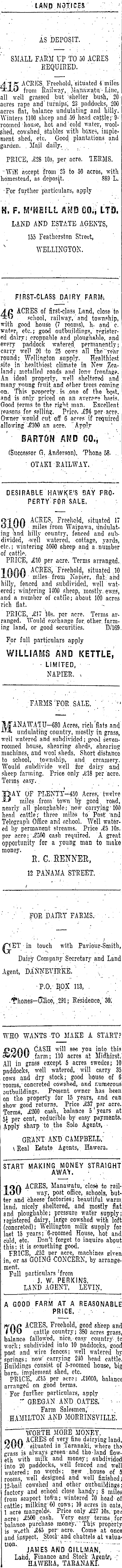 LAND NOT.ICES. AS DEPOSIT. . ' " SMALL FARM UP TO 50 ACRES ' REQUIRED. '" ."! .A-S £T ACRES. Freehold, situated 4 milesyfcJL«J fi- om Railway,. Manawatu/- Line, all well grassed but -shelter bush, 20 acres rape and' turnips; 23 paddocks, 200 acres flat, balance undulating and hilly. Winters 1100 sheep and 50 head ca.ttls; 9- ; roomed house, hot and cold water, woolshed, cowshed, stables with boxes, implement shed, etc. Good plantations and garden. . Mail daily. . PRICE, 428 105. per acre. TERMS. ■ Will accept from 25 to 50 acres, with homestead, as deposit. 889 L. ■For further particulars, apply H. F. M'NEELL AND GO.j LTD, LAND AND ESTATE AGENTS, 155 Feathc-rston Street, WELLINGTON. FIRST-CLASS DAIRY FARMi Af* ACRES, of first-class. Land, close to '*" school, railway, and township, with good houße (7 rooms), h- and c. water { etc.; good outbuildings,'register- • ■ed dairy; croppable and.ploughable, and every paddock watered permanently; carry well 20 to 25 cows all the'"ye'ar round; Wellington supply. Healthiest site in ' healthiest climate in New Zealand; metalled roads and Ion? frontage. An ideal property, well sheltered and many young fruit.and other trees coming on. This property. is .one of the best, and is only priced on an avera"? basis. .Good terms to the right man. Excellent reasons for selling. Price. 494 per acre. Owner would cut off 6 aces if required allowing"4100 an acre. Apply BARTON AND CO., (Successor G. Anderson), 'Phone 58- ~ ■ OTAKI RAILWAY, DESIRABLE HAWSE'S BAY PROPERTY' FOR SALE, O-JAA ACRES, Freehold, situated 17 OxyV miles from Waipawa, Undulating and hilly country, fenced and subdivided, -well watered, -cottage, yards, etc.; wintering 5000 6heep and a.number of cattle. PRICE, 410 per acre. Terms arranged, 1 fUfbfb ACRES » Freehold, situated ,10 -L"«« miles from Napier,. flat: and hilly, fenced and subdivided, well watered; wintering 1400 sheep, mostly, ewes, and a number of cattle; about 100 acres rich fiat. ' PRICE, 417 \os. per acre. Terms arranged. Would exchange for. other, farming land, or good securities. D/ 169. For full particulars apply WILLIAMS AND KETTLE, ■ LIMITED, NAPIER, v ' : . FARMS "FOE. SALE. ' '. '■ ' ]l/jrANAWATU-680 Acres, rich'flats and undulating country, mostly in grass, we'll watered and subdivided; good sevenroomed house, shearing sheds, shearing machines, and wool sheds. Short distance to school, , township, and creamery. Would subdivide well ior dairy and sheep farming. Price only ,£lB per acre. Terms easy.. BAY OF PLENTY-450 Acres, twelve miles from' town by good, road, nearly all ploughable;.now carrying' 100 head cattle;' three miles to Post,'and Telegraph Office and school. Well watered by permanent streams. Price 45 10s. j per acre; 4500 cash required. A great opportunity for a young man to mnke money. R. G. EENNER, 12 PANAMA STREET. . foe'daiby FAEMS.- .-. touch with Paviour-Smith, Dairy Company Secretary and Land Agent, DANNEVIRKE.'' ■ P.O.- B.OX 113, . .fhones-Oifice, .291; Residence,' 30; WHO WANTS TO MAKE A START? JQOAA CASH will see you into this farm; 110 acres at Midhirst.' All in grass except 5 acres swedes; 10 paddocks, well watered, will carry 35 cows and dry stock; good house of 6 rooms,'concreted cowshed, and r.umerou6 outbuildings. Present owner has been on the property for 15 years, and can' show good returns. Price 437 par acre. Terms, 4200 cash, balance 5 ' years at &\ per cent, reducible by easy payments. Apply sharp to the Solo Agents, •• GRANT- AND CAMPBELL,' ' vßeal Estate Agents, Hawera. . START MAKING MONEY STRAIGHT AWA\. -j qa ACRES, Manawatu, close to railJLOU ' way, post office, schools, butter and cheese factories; beautiful warm; land, nicely sheltered, and mostly flat and ploughable; pressure water supply; registered dairy, large cowshed with loft (concreted); Wellington milk supply for last 15 years;"6-roomed House, hot and cold, etc. Don't forget to inquire abput this; it is something good. FRICE, .£52 per acre, machines given in, or as GOING CONCERN, by arrange- . ment. Full particulars 'from J. W. PERKINS, LAND AGENT, LEVIN. A GOOD FARM AT A REASONABLE PRICE. . - W(\n ACRES, Freehold, good sheep and lIkO cattle country; 380 acres grass, balance fallowed, nice,-easy country to work; subdivided into 10 paddocks, good post and wire fences; well watered by springs; now' carrying 240 head cattle. Buildings consist of 5-roomed house, big barn, implement shed, etc. PRICE, 415 per acre; 410C0, balance arranged on good terms. ■ For further particulars, apply •' GREGAN AND.OATES," ■• Farm Salesmen,' . HAMILTON AND MORRINSVILLE. . ~ '~~ WORTH MORE MONEY. OAffc ACRES of very fine dairying land, ,4i\r\f. situated in Taranaki, where th? grass is always green and tho land flow-, eth with milk and money; subdivided into 20 paddocks, well fenced and well watered; no weeds; new .house of -5 rooms, well designed and well finished;; 12-bail cowshed and other outbuildings; factory and school close handy; 8 milesfrom seaport 'toti'n; wintered 70 head of cattle; milking'6o cows; 10 acres in oats, 1 acre mangolds. Price only £27 10s. pej acre; 4500 cash. Very easy terras for balance purchase money. " This property is wurth 445 per- acre. Come at once and .inspect. _Stocl" and chattels at valuation. "' JAMES AND GILLMAN, . Land, Finance and Stock Agent/i, ■' HAWEEA. TAEANAKI.