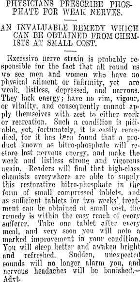 PHYSICIANS PRESCRIBE PHOSPHATE FOE WEAK NERVES. AN INVALUABLE REMEDY WHICH CAN BE OBTAINED PROM CHEMISTS AT SHALL COST. Excessive nerve strain is probably responsible for the fact that all round us we see men and women who have no physical ailment or infirmity, yet aro weak, listless, depressed, and 'nervous. They lack energy; have no vim, vigour, or vitality, and consequently cannot apply themselves with zest to either work or recreation. Such a condition is pitiable, yet, fortunately, it is easily remedied, for it has I;"en found that a product known as bitro-phosphate will re6roro lost nervous energy, and make tho weak and listless strunc: and vigorous ngain. Readers will find that high-class chemists everywhere aro able to supply this restorative bitro-phosphnte in the form of emnll compressed tablets, and ns sufficient tablets for two weeks', treatment can be obtained at small cost, the remedy is within tho easy reach of every sufferer.' Take one tablet after every meal, and very soon you will notes a marked improvement in your condition. You will fileop hotter and iurttkon bright and refreshed. Sudden, unexpected I sounds will no longor alarm you, and i nervous headaches will l>e banished.— Advt.