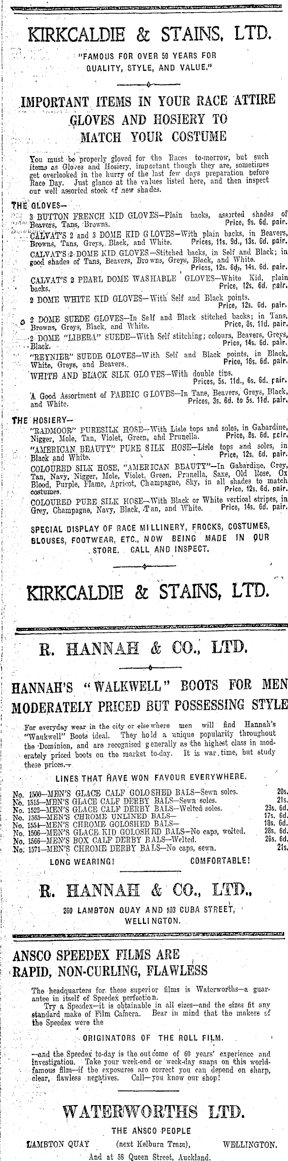 j -' '— 'ihmiiiii i mi m-mm —r— "»"■"'""""'■ -mm mmuuumui I KIRKCALDIE &■ STAINS, LTD. >■'.";!:. -.-< "FAMOUS FOR OVER 50 YEARS FOR : QUALITY, STYLE, AND VALUE." j, ■ '."■'■■ . I. ...IMPORTANT..ITEMS IN YOUR RACE ATTIRE |....-,.. AND H pSIERY T0 I;•-;,;:, •, MATCH TOUR' COSTUME You must ; be properly gloved for 'fclio Races to-morrow, tat such 1 items as Glovm and Hosiery, important though they are, sometimes 1 get overlooked in the hurry of the last few days preparation, before i Race Day. Just glance at the values listed here, and then inspect our well assorted stook '.t'nev shades. 1 THE GLOVES- V ! * 3 BUTTON FRENCH KID GLOVES-Plain backs, assarted shades of " Bearers, Tone, BroTOS. Price, 9s. 6d, pair, i J ' "cALVAT'S 2 and 3 DOME KID G LOVES-With plain backs, in Beavers, j Itawiw, Tans, Greys,, Black, and White. Prices, 11s. 9d., 13s. 6d. pair. I CALV\.T J S'2-DOiIE KID,GLOVES —Stitched backs, in Self and Black; in 1 good shades of Tans, Beavers, Browns, Greys, Black, and White. 8 ■ -. • ' Prices, 12s, 14s. 6d. pair. i CiIVVTS 3 PEARL DOME WASHABLE GLOVES-White Kid, plain I . backs.' ' . Price. 12s. 6d. pair. ! 2 DOME WHITE KID GLOVES-With'' Self and Black points. * 2 DOME SUEDE GLOVES-In Self and Black -stitched backs; in Tans, I ° Browns, Greys, Black, and White. . Price, Bs. 11d. pair, 2 DOME "LIBERA" SUEDE-With Self stitching; colours, Beavers, Greys, ' Black. •• • PnM, Us. 6d. pair, "REYNIER" SUEDE GLOVES-With Self and Black points in Black, Wlnte, Greys, and Beavers.. Price, 16s. 6d. pair. WHITE AND BLACK SILK. GLOVES-With double ' L G litc SsortoeDt of ™ IC(JLOTBS - In pS; te MS I THE HOSIERY- . ■• « v ~ ■ "R4DMOOR-" PTJEESILK HOSE-With Lisle tops and soles, in Gabardine, Niggei, Mole, Tan, Violet, Green, add Prunella. Price,.Bs. 6d. ptlr. "AMEEICAN, BEAUTY" PUKE SILK HO3E-Li?le tons and .soles, in Black and White. - • P™ e > 12s ' 6d ' P air v ' COLOURED , SILK HOSE, "AMEEICAN BBAOTT'-In Gabardine, Grey, Tan, Navy, Nigger, Mole, Violet Green, Prunella, Sase, Old Lose, Ox i Blood, Purple, Flame, Aprioot, Champagne, Sky, m all shades tcimateh costumes. ' rlc ' "■ pair. COLOURED PURE SILK HOSE-With Black or White vertical stripes, in I Grey, Champagne, Navy,.Black,'-Tan, and White. Price, 14s. 6d. pair. SPECIAL DISPLAY OF RACE MILLINERY, FROCKS, COSTUMES, BLOUSES, FOOTWEAR, ETC., NOW BEING MADE IN PUR .STORE. . CALL AND INSPECT. . -* KIRKCALDIE & STAINS, LTD." ! B. HANNAH & GO.; LTD. I. .. ■ ': ' —;—__«—: ■ ■ ' ' . HANNAH'S : ''WALKWELL" BOOTS FOR MEN MODERATELY PRICED BUT POSSESSING STYLE For everyday weax in the city or else where men will find Hannah's "Waukwell" Boota ideal. They hold a unique popularity throughout ' the Dominion, and are recognised generally 'as the highest, class in modeiately priced boots on the market to-day. It is war.time, but study I pnees.-r. : . ■ LINES THAT HAVE WON FAVOUR EVERYWHERE. No 1500-MEN'S GLACE CALF GOLOSHED BALS-Sewn soles. 20s. Ko' 1515-MEN'S GLACE CALF DERBY BALS-Sewn-soles. 21s. No 1522-MEN'S GLACE CALF DERBY BALS-Welted soles. ' 235. 6d. i No WOS-MEN'S CHROME TJNIINED BALS- . . 17s. 6d. No 155±-MBN'S CHROME GOLOSHED BALS- 18s. 6d. , No 1506-MEN'S GLACE. KID GOLOSHED BALS-Nb caps, welted. , 28s. 6d. No 1566-MEN'S BOX CALF DERBY BALS-Welted. 265. 6d. No 1571-MEN'S CHROME DERBY BALS-No caps, sewn. 21s. LONG WEARING! COMFORTABLE! E. HANNAH & ' CO., LTD.. . 260 LAMBTON QUAY AND 103 CUBA STREET, ' i WELLINGTON. . ANSCO SPEEDEX FILMS ARE f ■-.-. . • RAPID, NON-CURLING, FLAWLESS The headquarters for. these superior films is Waterworks—a guari antec in itself of Speedex perfection. Try a Speadex—it is obtainable in all eizes—and the sizes fit any standard raiJce of Film Camera. Bear in mind that the mnters t-f ' the Speedex were the i* ■ ' .ORIGINATORS OF THE ROLL FILM. . —end the,Speedex to-day is the outcome of 60 years' experience and investigation. ' Take your week-end or'week-day enaps on this worldfamous film—if tbo exposures a.ro correct you can depend on sharp, clear, flawless - negatives. Call—you know our shop! LTD. i THE ArJSCO PEOPLE L'AMBTON QUAY (next Kelburn Tram), WELLINGTON. ' And at 58 Queen Street, Auckland:.