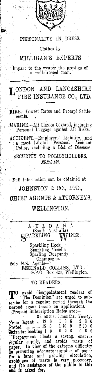 'V PERSONALITY IN, DRESS. i i ' Clothes by f ' MILLIGAN'S EXPERTS i Impart to the wearer the prestige of ' v . a well-dressed man. [ T ONDON AND . LANCASHIRE I FIRE INSURANCE CO., LTD. ; jr IRE.—Lowest Rates and Prompt Settler meats. , • , MARINE.-All Classes Covered, including J ' Porsonal Luggage against All Risks. i ACCIDENT.-Bmployers'. Liability, and ■ : a most Liberal Personal Accident Polioy, including a Lint of Diseases. ! SECURITY TO POLICYHOLDERS. I/''--. X 6.2-19.479. '■ Full information can be obtained at i JOHNSTON & CO., LTD., ■ CHIEF AGENTS k ATTORNEYS, ! WELLINGTON. ' A~U L D A N A !' ' . (South Australia) I. '•' SPARKLING WINES- ! ;.: Sparkling Hock ! Sparkling Mosello '; Sparling Burgundy ' ; Champagne. Sole N.Z. Agents-' ! REGINALD COLLINS, LTD., 1 G.P.O. Box 42fi, Wellington. i ' TO READERS. TO avoid disappointment readers of "The Dominion" arc urged to sub- ! «ribo for a regular period through the ! nearest agent (npmo on application). , I Prepaid Subscription Ratee are:— ! ■ ■ 3 months. 6 months. Yearly. 1 iftom Agent ... 12 0 13 6 26 0 ! Posted 15 3. 110 0 219 0 J Extra far booking J 0 02 6 06 0 i Prepayment effects a saving, ensures i tegular supply, and avoids waste of ! paper. In view of the extreme difficulty i |n procuring adequate ■ supplies of paper • for a large and growing oiroulation, I nvoidljoo of waste is vciy necessary, '■ tod tHe aeaifftanoa of the publio to thii !■■■ and ii aiked for,