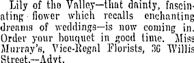 Lily of tho Valley—that dainty, fascinating flower which recalls enchanting dreams of weddings—is now coming in. Order your bouquet in good time. Miss Murray's, Vice-Regal Florists, 30 Willis Street.-Advt.