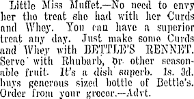 Little Miss Muffet.—No need to envy her tlio treat eho had with her Curds nnd AVlioy. You can have n superior treat nny day. Just make 6onio Curds nnd Whey with BETTLE'S RENNET. Serve' with Rhubarb, Or other seasonable fruit. It's u dish superb. Is. 3d. buys RCnoi'ous sized bottle of Bottle's. Order from your grocor.—Advt.