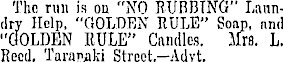 The rim is on "NO RURBTNG" Lanndry Help, "GOLDEN RULE" Soap, nnd "dOLDEN MILE" Candles. Mrs. L. Reed, Taranaki Street.—Advt.